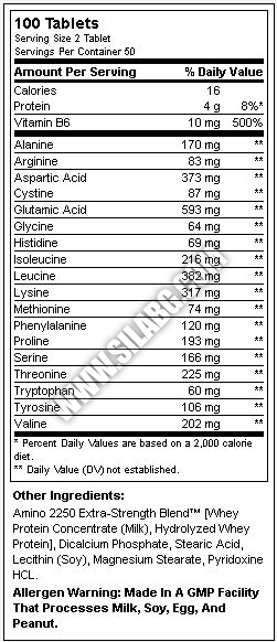 Universal’s Amino 2250 е висококачествена, максимално мощна аминокиселинна формула, получена от най-чистите WPH /суроватков протеинов хидролизат/ и WPC /суроватков протеинов концентрат/.