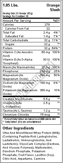 Съставки: витамин С, витамин Е, фосфор, ниацин, магнезиев оксид, креатин монохидрат, глутамин, таурин, суроватъчен протеин