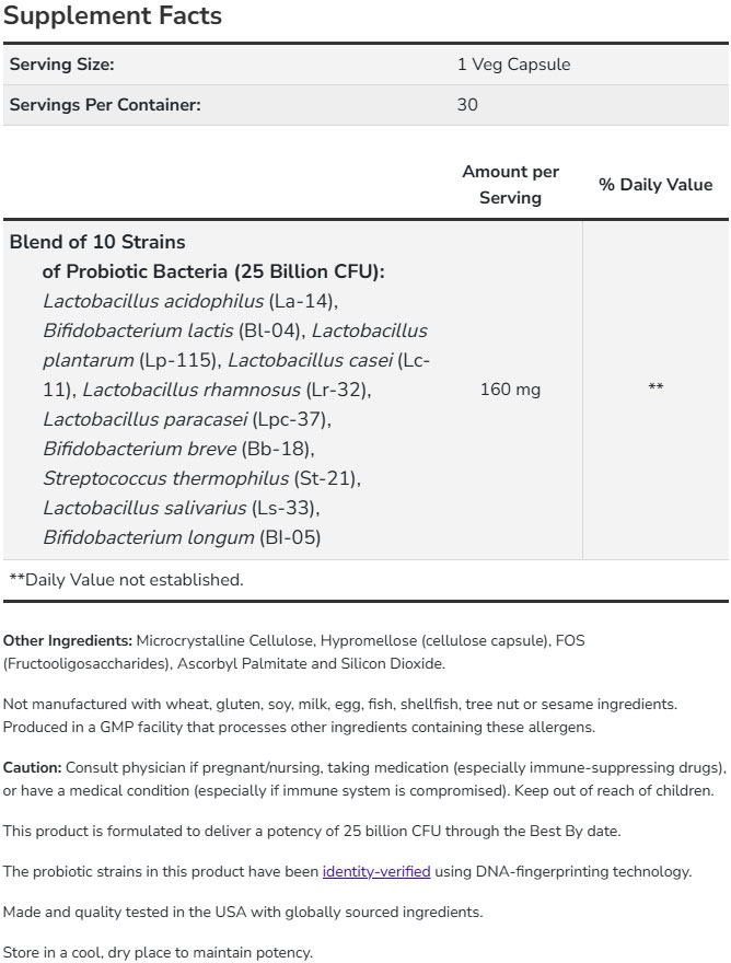 NOW Probiotic е създаден, за да осигури мощен и балансиран спектър от полезни бактерии, които са намерени в стомашно – чревния тракт. Честият прием на полезни пробиотици може да спомогне за поддържане на здрава стомашно – чревна флора. Продуктът съдържа и