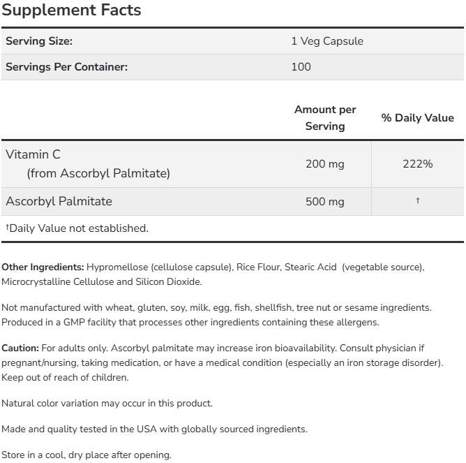 NOW Ascorbyl Palmitate (Аксорбил Палмитат) е малко позната мастноразтворима форма на аскорбиновата киселина (витамин С). За разлика от витамин С, който е водоразтворим, аскорбил палмитатът се усвоява далеч по-лесно в клетъчните мембрани. Този мощен аналог на витамин С „прочиства” успешно организма от натрупаните свободни радикали и има огромен принос за поддържането на здрава кожа и жизнения тонус.