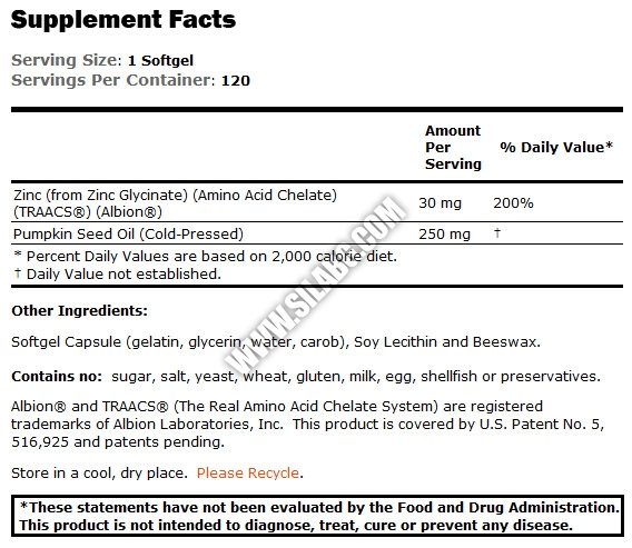Цинкът е минерален кофактор при стотици ензимни реакции, свързани с протеиновия и въглехидратен метаболизъм, синтеза на РНК/ДНК и междуклетъчната сигнализация. Цинкът се явява съществен за нормалната функция на много органи и системи в тялото; стимулира силна имунна система, скелетната, неврологичната и ендокринната функции, както и здравето на простата. Хранителната био-достъпност на цинка е сравнително ниска, ето защо продуктът