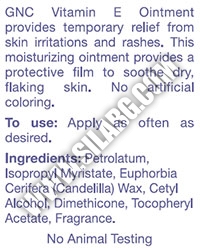 GNC Vitamin E Ointment съдържа ударна доза от мощния антиоксидант - витамин Е, който ефективно предпазва кожата от процесите на стареене. Витамин Е повишава еластичността на кожата и предпазва липидите и колагеновите влакна от окисляване или разрушаване. Той има свойството да задържа други мастноразтворими витамини в повърхността на кожата.