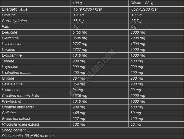 Препоръчителна дозировка: една доза= 55 г. Приемайте една доза 45 минути преди тренировка.