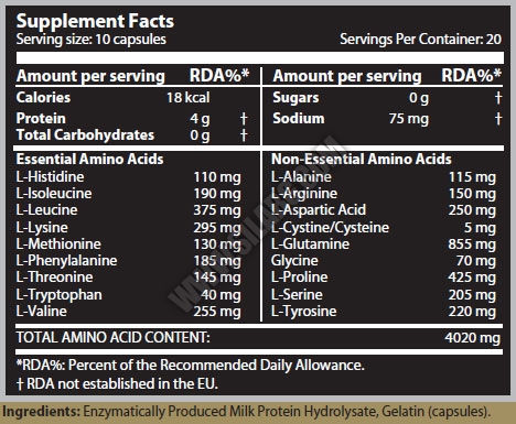 Начин на употреба: Една доза е равна на 10 капсули. Консумирайте дозата преди/или по време на тренировка за стимулиране на мускулната протеин синтеза, за намаляване на разграждането на тъканта и повишаване на резултатите. Възможна е употребата на 1 доза непосредствено след физическо натоварване за светкавично възстановяване нивата на гликоген в мускулите, както и увеличаване на мускулната протеин синтеза!
