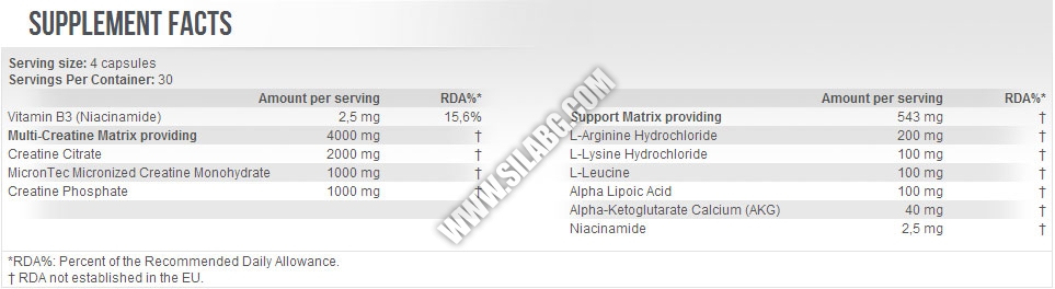 Scitec King Creatine на типичните отрицателни ефекти, характерни за монохидратния вариант (диария, задържане на вода/подуване и спазми)! Попадането на суплемента в кръвотока и достигането му до клетките представляват важни стъпки, но за максимален ефект е необходимо неговото проникване в тях. За тази цел към формулата е добавена алфа липоева киселина, с нейния мощен, имитиращ инсулина ефект. Незаменимата аминокиселина Лизин стимулира допълнително общия анаболен резултат от продукта!
