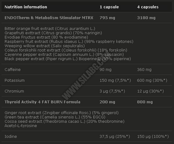 Съставки: Potassium chloride, ginger root extract (Zingiber officinale Rosc.), caffeine, Evodiae fructus extract, bitter orange fruit extract (Citrus aurantium L.), weeping willow extract (Salix sepulcralis), raspberry fruit extract (Rubus idaeus L.), Coleus forskohlii root extract, grapefruit extract (Citrus grandis), cocoa seed extract (Theobroma cacao L.), green tea leaves extract (Camellia sinensis L.), acetyl-L-tyrosine, cayenne pepper extract (Capsicum annuum L.), black pepper extract (Piper nigrum L.) Bioperine®; potassium iodide, chromium (III) chloride, bulking agent – microcrystalline cellulose, anti-caking agent - magnesium stearate, capsule (gelatin bovin, colour: E 171).