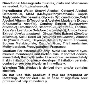 MSM & Glucosamine Crème е продукт за локално приложение с мощно действие, който намалява болката и възпалението в мускулите и ставите. Формулата съчетава действието на метилсулфонилметан (MSM) – съединение, което участва във формирането на съединителните тъкани, глюкозамин сулфат и екстракти от алое вера, арника, лайка, черен оман, джинджифил и други.