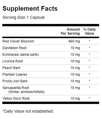 Съставки: корен от жълт лапад, цвят от червена детелина, корен от глухарче, листа ехинацея, корен от женско биле, кора от праскова, листа живовляк, бодлив храст, корен сарсапарила