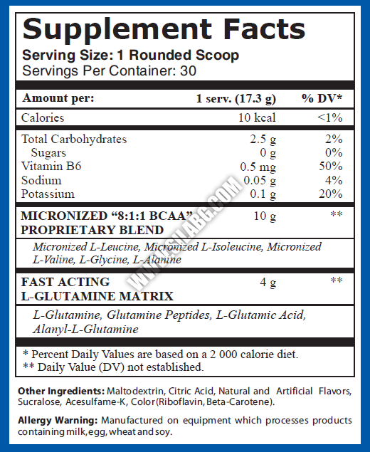 Уникалното в него е наличието на 7.5 гр Леуцин в доза, което е изключително добре, а щом се касае до Леуцина, това е изключително важен за синтеза на мускулна тъкан. Самата комбинация на БЦАА в съотношение 8:1:1 говори достатъчно по себе си. Да не забравяме и 4 гр Глутамин, които съща са от голямо значение.