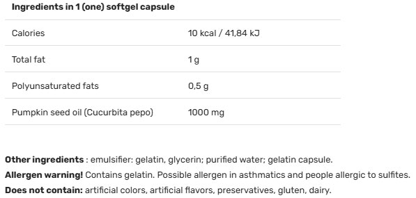 GNC Pumpkin Seed Oil 1000 съдържа масло от тиквено семе, което подпомага здравословното състояние на простатната жлеза, поддържа функцията на пикочния мехур и успокоява дискомфорта при уриниране. Маслото от тиквено семе подобрява сексуалната и репродуктивна функция. Освен това, то стимулира кръвоносната, храносмилателната, опорно-двигателната система и има благоприятно действие върху зрението.