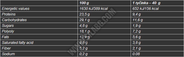 Съставки:Малтитолов сироп, мляко глазура (малтитол, хидрогенирано растително масло, какао, мляко, суроватка, соев лецитин), соев протеинов изолат, млечен протеин изолат, сгъстител: полидекстроза, желатин хидролизат, инулин, соя, царевично нишесте Hi-Maize, ориз, картофи екструдатът, емулгатор, рапичен лецитин, аромат, сорбинова киселина.