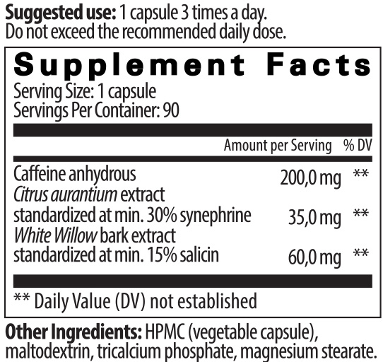 Активна субстанция в една капсула: 200,0 mg Caffeine аnhydrous (безводен кофеин), 35,0 mg сух екстракт от Citrus aurantium (бергамот), стандартизиран по отношение на синефрин, не по-малко от 30,0 %, 60,0 mg сух екстракт от White Willow bark (кори от бяла върба), стандартизиран по отношение на салицин, не по-малко от 15 %.