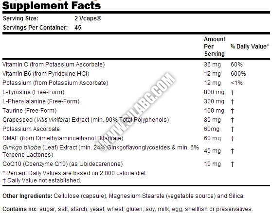 Съставки: Фенилаланин, тирозин, таурин, екстракт от гроздово семе, Coenzyme Q10 (CoQ10), гинко билоба, витамин В6, витамин С, калий, DMAE (dimethylaminoethanol)