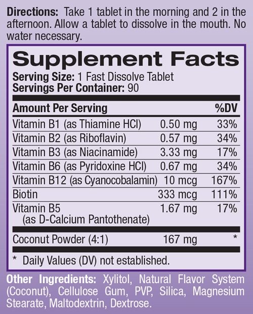 Таблетките NATROL B-Complex Fast Dissolve са създадени чрез бързо разтворима технология, която позволява по-добро усвояване на активните съставки от организма и имат приятен вкус на кокос.
