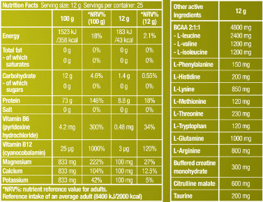 Формулата е допълнена от ценни витамини и минерали, като магнезий и витамин В12 и В6 за намаляване на умората и стреса. Калций и калий за добавени в подкрепа на нормалната мускулна функция.