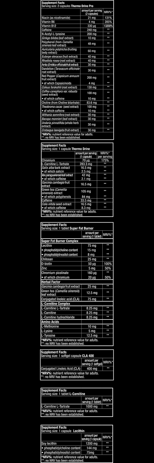 Thermo Drine Pack от BioTech USA включва лецитин, комбинация от холин и инозитол, който подпомага изгарянето на манзин, намалява вредния холестерол в кръвта, стимулира нервната система и ускорява възстановяването. Друга активна съставка във формулата е хром, който допринася за нормалния метаболизъм на хранителните вещества (протеини, въглехидрати и мазнини. Неговото действие е допълнено от това на холин, който съдейства за поддържане на нормална обмяна на мазнините в тялото.