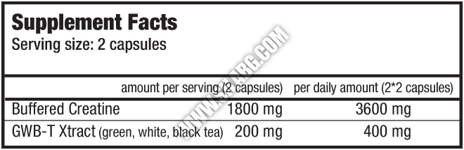 buffered creatine monohydrate formula 76.8%, gelatin capsule shell, black tea extract 3%, green tea extract 3%, white tea extract 3%.