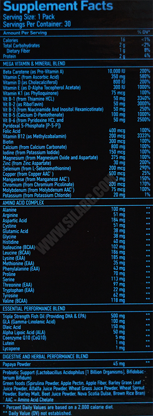 MEX M PAK PRO осигурява всичко необходими хранителни елементи, като повишава физическия капацитет и подпомага спортните постижения. Този продукт ускорява възстановяването, повишава естествените защитни сили на тялото, стимулира сърдечната дейност, подобрява усвояването на веществата и укрепва здравето на мускулите и костите. Приемът на този уникален продукт намалява риска от претоварване и спира катаболитните процеси, за да предпази тялото от загуба на мускулна маса. Освен това, благодарение на комеплекса от пробиотици и храносмилателни ензими, той подпомага храносмилателната дейност.