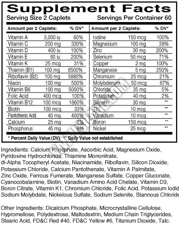 Съставки: витамин А, витамин С, витамин Е, витамин К, витамин В6, витамин В12, ниацин, борон, рибофлавин, цинк, селен, хром, манган, биотин, калций, тиамин