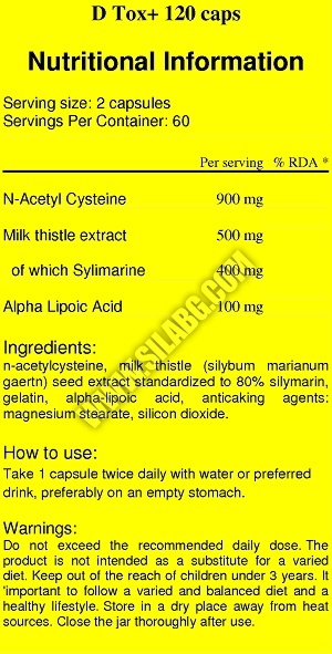 D TOX + е хранителна добавка, съдържаща алфа-липоева киселина, н-ацетилцистин и екстракт от бял трън, по-познат у нас като магарешки бодил.
