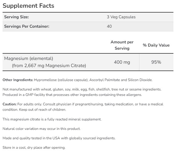 Magnesium Citrate осигурява продължително освобождаващ се магнезий, увеличавайки продължителността на неговото действие. Магнезият е един от най-важните елементи, нужни за правилното функциониране на нервната система, сърдечната и скелетната мускулатура. Магнезият също така участва и в производството на над 300 ензима.