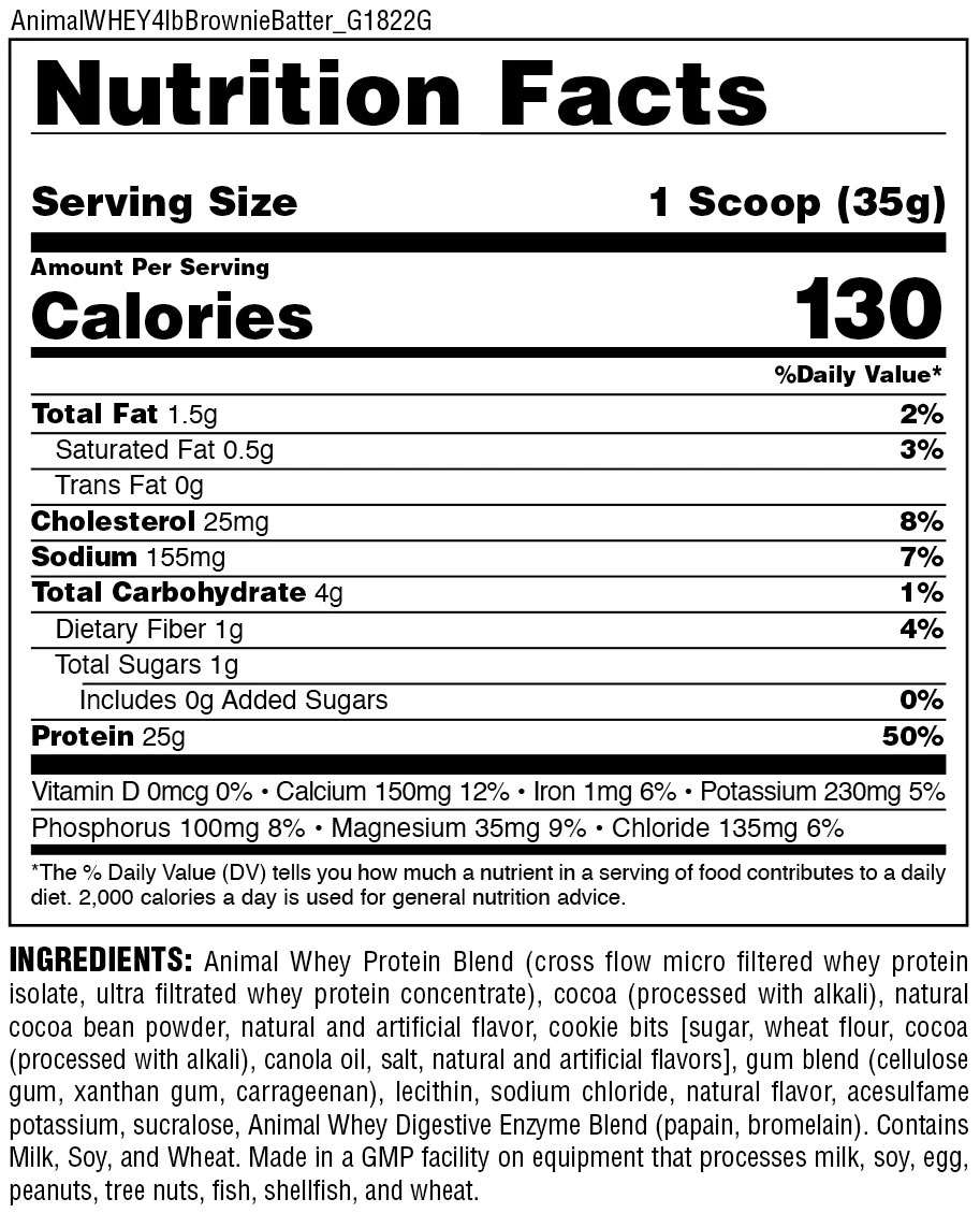 Съставки: Animal Whey Protein Blend [Cross Flow Micro Filtered Whey Protein Isolate, Ultra Filtrated Whey Protein Concentrate (Milk)], Cocoa (Processed with Alkali), Natural and Artificial Flavors, Cellulose Gum, Xanthan Gum, Carrageenan, Lecithin (Soy), Sodium Chloride, Acesulfame Potassium, Sucralose, Animal Whey Digestive Enzyme Blend (Papain, Bromelain).
