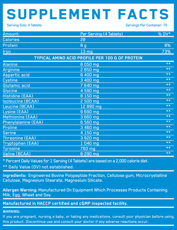 Най-големият минус на повечето телешки аминокиселини е безумно слабият аминокиселинен профил. Повечето телешки аминокиселини са извлечени от желатин и са богати на пролин, хидроксипролин и лизин, но в същото време са изключително бедни на верижно разклонените аминокиселини - левцин, изолевцин и валин, както и на най-разпространената аминокиселина в тялото глутамин. Интересното при този продукт е начин на хидролиза на аминокиселини и изходният продукт - кръвни еритроцити. Крайният продукт е доста интересен, защото е по-богат на есенциални аминокиселини и на левцин дори и от СУРОВАТКАТА ! До тук с теорията... идва ред и на практиката. Пих въпросните аминокиселини 2 седмици и наистина възстановяването е значително подобрено сравнение с всеки друг тип аминокиселини. Хубавото е че нямат желязо, защото с него би било лесно да се натрови човек поради високите дози желязо в еритроцитите. За покачване на мускул не мога да говоря поради краткият период, в който приемах продукта, но и това са аминокиселини, те имат индиректен ефект върху качването на чиста мускулна маса.