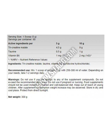 Съставки: Tri-creatine malate, Taurine, Vitamin B6.