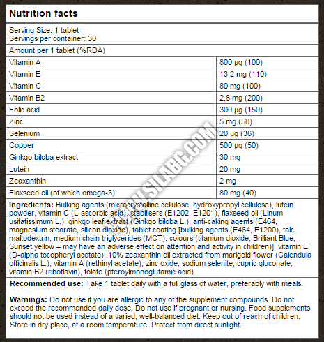Съставки: Vitamin A, Vitamin E, Vitamin C, Vitamin B2, Folic acid, Zinc, Selenium, Copper, Gingo biloba extract, Lutein, Zeaxanthin, Flaxseed oil.