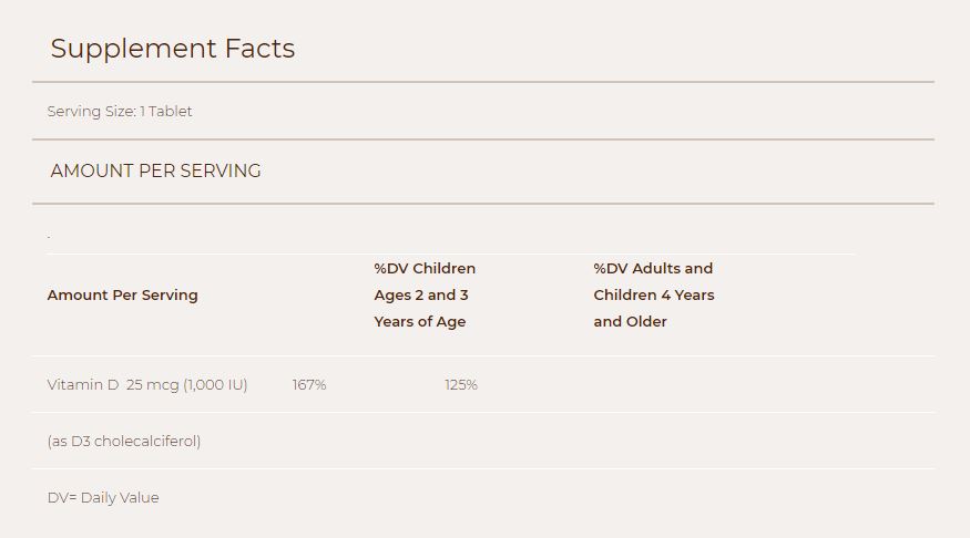 Съдържание: вит. D3, микрокристална целулоза, растителна целулоза, растителна стеаринова киселина, растителен магнезиев стеарат, растителен глицерин, рибофлавин.