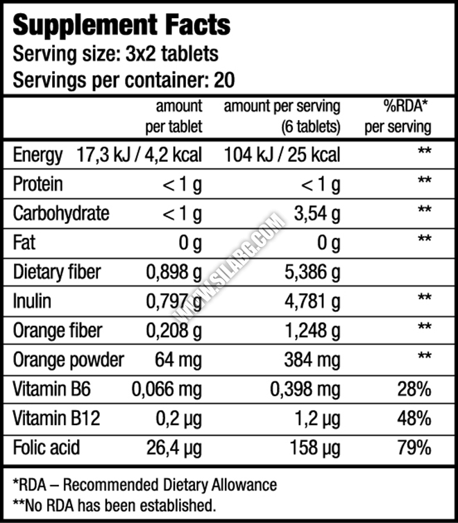 Съставки: Inulin, sorbitol, acesulfame K, Citrus fiber, orange powder, talc, magnesium salts of fatty acids, carotenes, pyridoxine hydrochloride, pteroylmonoglutamic acid, cyanocobalamin.