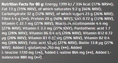 Съставки: Glucose-fructose syrup, soy protein isolate, milk-chocolate coating [sugar, vegetable oil (palm kernel), whey, cocoa, milk, emulsifiers (soy lecithin), flavour], whey protein concentrate, invert syrup, soy flakes, vegetable oil (palm, palm kernel, shea), cream with hazelnuts (sugar, vegetable fat (palm, shea), whey, roasted hazelnuts, cocoa, emulsifier (soy lecithin,aroma), coconut (coconut, antioxidant: sulphur dioxide), corn-potato extrudate (corn semolina, mashed potatoes, sugar, wheat fibre), emulsifier (rape lecithin, cocoa, L-glutamine, thickener (guar gum), flavour, antioxidant additives (E-306, E-304, E-300), L-leucine, multivitamin premix (vitamins: E, B1, B2, B6, B12, B5, B3, C, biotin, folic acid), L-isoleucine, L-valine, preservative (sorbic acid).