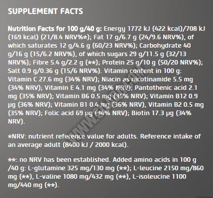 Glucose-fructose syrup, soy protein isolate, milk-chocolate coating [sugar, vegetable oil (palm kernel), whey, cocoa, milk, emulsifiers (soy lecithin), flavour], whey protein concentrate, invert syrup, soy flakes, vegetable oil (palm, palm kernel, shea), cream with hazelnuts (sugar, vegetable fat (palm, shea), whey, roasted hazelnuts, cocoa, emulsifier (soy lecithin,aroma), coconut (coconut, antioxidant: sulphur dioxide), corn-potato extrudate (corn semolina, mashed potatoes, sugar, wheat fibre), emulsifier (rape lecithin, cocoa, L-glutamine, thickener (guar gum), flavour, antioxidant additives (E-306, E-304, E-300), L-leucine, multivitamin premix (vitamins: E, B1, B2, B6, B12, B5, B3, C, biotin, folic acid), L-isoleucine, L-valine, preservative (sorbic acid).