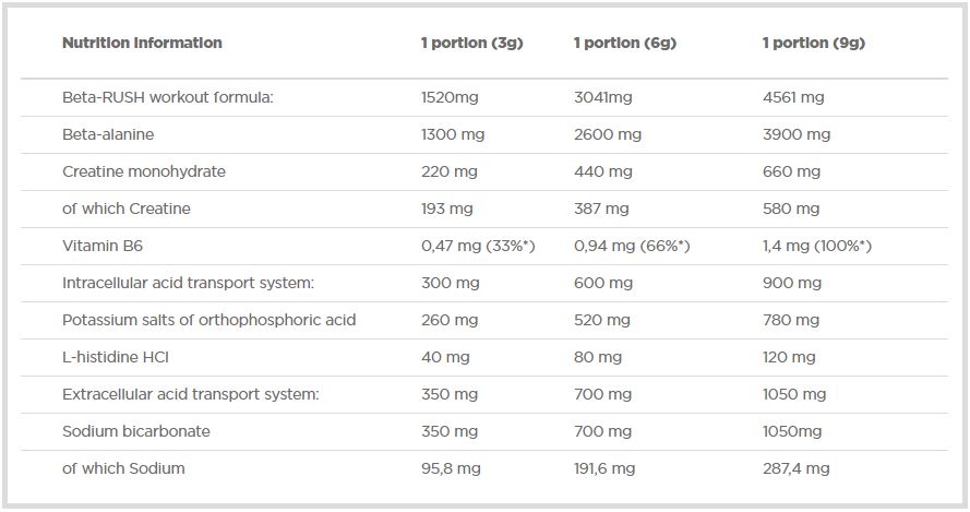 Съставки: Бета- аланин, кратин монохидрат, витамин В6, калий, натрий, Л-Хистидин.