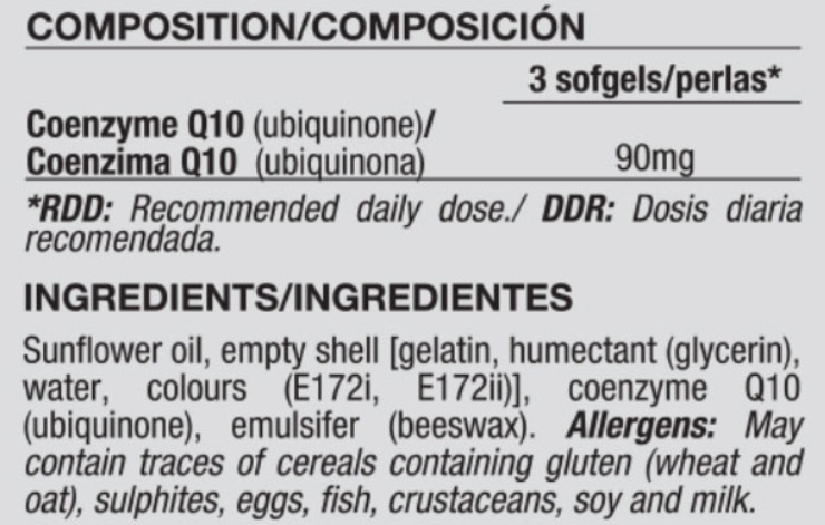 Съставки: Коензим Q10, пълнител (малтодекстрин), противослепващи агент (магнезиев стеарат), пълнител (хидроксипропилметилцелулоза).