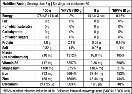 CreaFlash Creatine Complex 56% (CreaArg HCl, буфериран микронизиран креатин, креатин цитрат), CreaFlash Matrix [Energy Recycling Blend (калциев цитрат малат, L-аргинин алфа-кетоглутарат, магнезиев цитрат, железен (III) фумарат, ниацин), ATP Energy Blend (аденозин монофосфат, рибоза, желязо пирофосфат, пиридоксин хидрохлорид), метаболитен смес (алфа липоева киселина, цинков оксид, хромен хлорид хексахидрат)], киселина (лимонена киселина), ароматизанти, пълнител (карбоксиметил целулоза), сол, подсладител (сукралоза), цветове (тартразин, Понсо 4R)