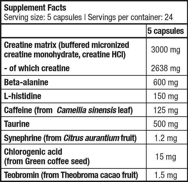 Креатинова матрица (буфериран микронизиран креатин монохидрат креатин HCl), състав на капсулата (желатин, пречистена вода, цвят: титанов диоксид), бета аланин, таурин, екстракт от чаени листа, L-хистидин, екстракт от бергамот, екстракт от зелено кафе на семена, екстракт от какаово дърво , противослепващите агенти (магнезиев стеарат, силициев диоксид).