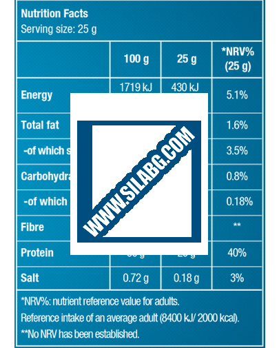Съставки: Оризов протеин 80%, какао на прах, инулин, емулгатор (соев лецитин), ароматизанти, канела, подсладител (сукралоза).