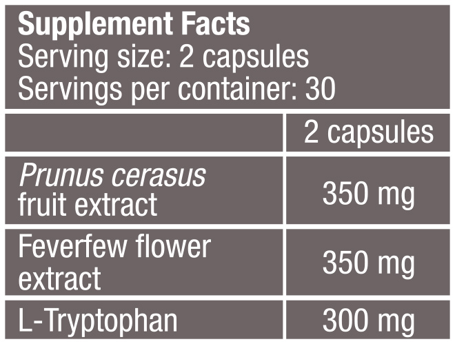 Съставки: Екстракт от Prunus Cerasus плодове, вратига (Tanacetumparthenium) екстракт, L-триптофан, състав на капсулата [желатин, пречистена вода, цвят (титанов диоксид)], пълнител (микрокристална целулоза), противослепващи агенти (силициев диоксид, магнезиев стеарат).