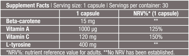 Съставки: L-тирозин, бета каротин, състав на капсулата [желатин, пречистена вода, цвят (титанов диоксид), L-аскорбинова киселина, пълнител (микрокристална целулоза), противослепващи агенти (силициев диоксид, магнезиев стеарат), ретинил ацетат.