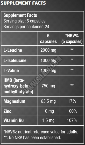Съставки: L-Leucine, L-Isoleucine, L-валин, желатинова капсула [желатин, пречистена вода, цвят (титанов диоксид)], бета-хидрокси-бета-метилбутират, противослепващи агенти (магнезиев стеарат, силициев диоксид), магнезий оксид, цинков оксид, пиридоксин хидрохлорид.