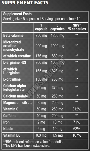 Съставки: Бета-аланин, микронизиран креатин монохидрат ,L-аргинин хидрохлорид, капсула [желатин, вода, цвят (титанов диоксид)], L-цитрулин, калций алфа-кетоглутарат, калций