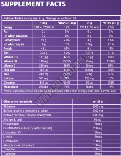 Съставки:Post-Workout аминоматрица [L-глутамин, BCAA (L-левцин, L-валин, L-изолевцин), буфериран микронизиран креатин, фенилаланин, Л-Хистидин, солна киселина, Л-лизин, Л-метионин, треонин, триптофан], въглехидратна матрица (малтодекстрин, изомалтулоза, декстроза, фруктоза), Бленда витамини и минерали (калциев карбонат, магнезиев оксид, аскорбинова киселина, пиридоксин хидрохлорид, цинков оксид, хром хлорид хексахидрат, фолиева киселина, цианокобаламин), калциев хидрокси метилбутират, екстракт родиола розеа корен, ароматизанти, сол, подсладител (сукралоза), алфа-липоева киселина.