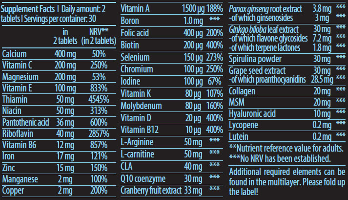 , лецитин, DHA прах (от рибено масло), L-аргинин, L-карнитин, анти спичащи вещества: магнезиев стеарат и стеаринова киселина, коензим Q10, червена боровинка (Vaccinium macrocarpon, 100% плодове), Китайски женшен (100% корен), гинко билоба (100% листа), спирулина прах, гроздови семена (Vitis Vinifera, 100% семена), бор лимонена киселина, риба колаген, метил сулфонил метан, цинков оксид, ретинол ацетат, хиалуронова киселина, силициев диоксид, холекалциферол, меден сулфат, манганов сулфат, хром хлорид хексахидрат, фолиева киселина, натриев селенит, натриев молибдат, биотин, Ликопен, лутеин, калиев йодид, зеаксантин, витамин К (филохинон), цианокобаламин, покритие (хидрокси пропил метил целулоза, цвят: титанов диоксид). Биотин, йод, ниацин, рибофлавин, витамин А и цинк допринася за поддържането на нормалната кожа. Селен, цинк и биотин допринасят за поддържане на косата. Цинк и селен допринасят за поддържане на ноктите