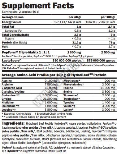 Съставки: Хидролизиран Beef Peptide HydroBeef ™, какао на прах, малтодекстрин, PepForm®-L-левцин пептиди (суроватъчни пептиди / от мляко /, L-левцин пептиди, L-Leucine), PepForm®-BCAA пептиди (суроватъчни пептиди / от мляко /, BCAA пептиди, L-левцин, L-изолевцин, L-валин), Pep-Form®-триптофан пептиди (суроватка пептиди / от мляко /, L-триптофан пептиди, L-триптофан), аромат, стабилизатор: колаген хидролизат; подсладители: сукралоза, стевиол гликозиди и ацесулфам-K; натриев хлорид, антиразпенващ агент: силициев двуокис; Lactospore ™ (Bacillus coagulans, малтодекстрин)