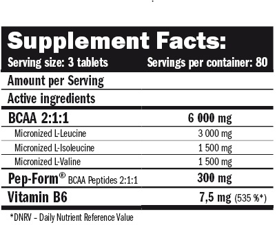 Съставки: микронизирани L-левцин, L-изолевцин, L-Валин, PepFormTM - BCAA пептиди (суроватъчни пептиди / от мляко /, BCAA пептиди, L-левцин, L-изолевцин, L-валин), противослепващи агенти: магнезиев стеарат, силициев диоксид