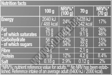 Състав: oats (38%), nonhydrogenated vegetable margarine, invert sugar syrup, raw cane sugar, pecans (5%), walnut (3%), vegetable glycerine, soy flour, aroma.