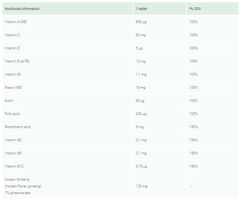 Olimp под формата на ефиверсцентни таблетки, която съдържа витамин B комплекс от B2, B6, B12 и екстракт от корейски жен шен.