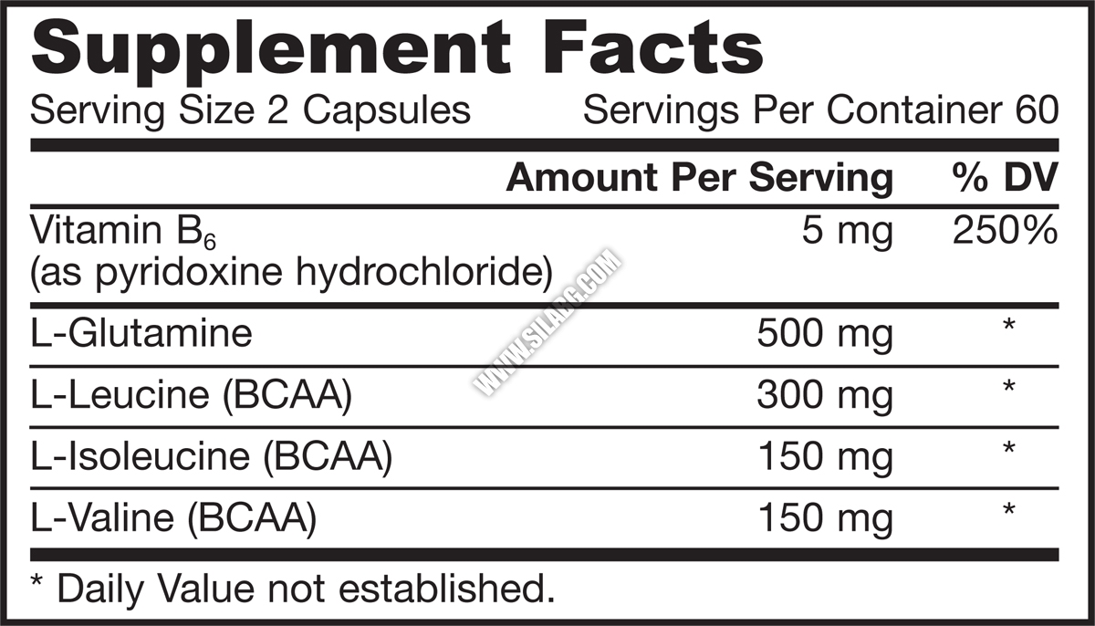 л-глутамин, л-левцин, л-изолевцин, л-валин, магнезиев стеарат (растителна основа), целулоза като капсулата е направена от желатин.