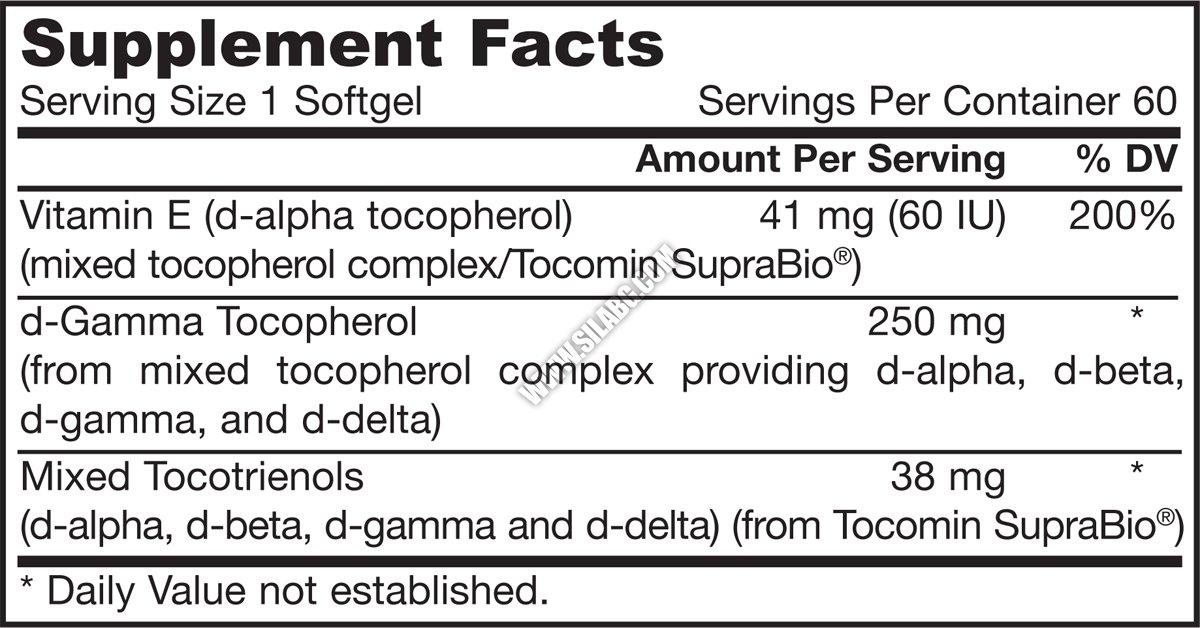 Tocomin SupraBio), d-Gamma Tocopherol (от миксиран токоферолов комплекс, доставящ d-alpha, d-beta, d-gamma, и d-delta токоферол), миксирани токотриеноли (d-alpha, d-beta, d-gamma и d-delta) (от Tocomin